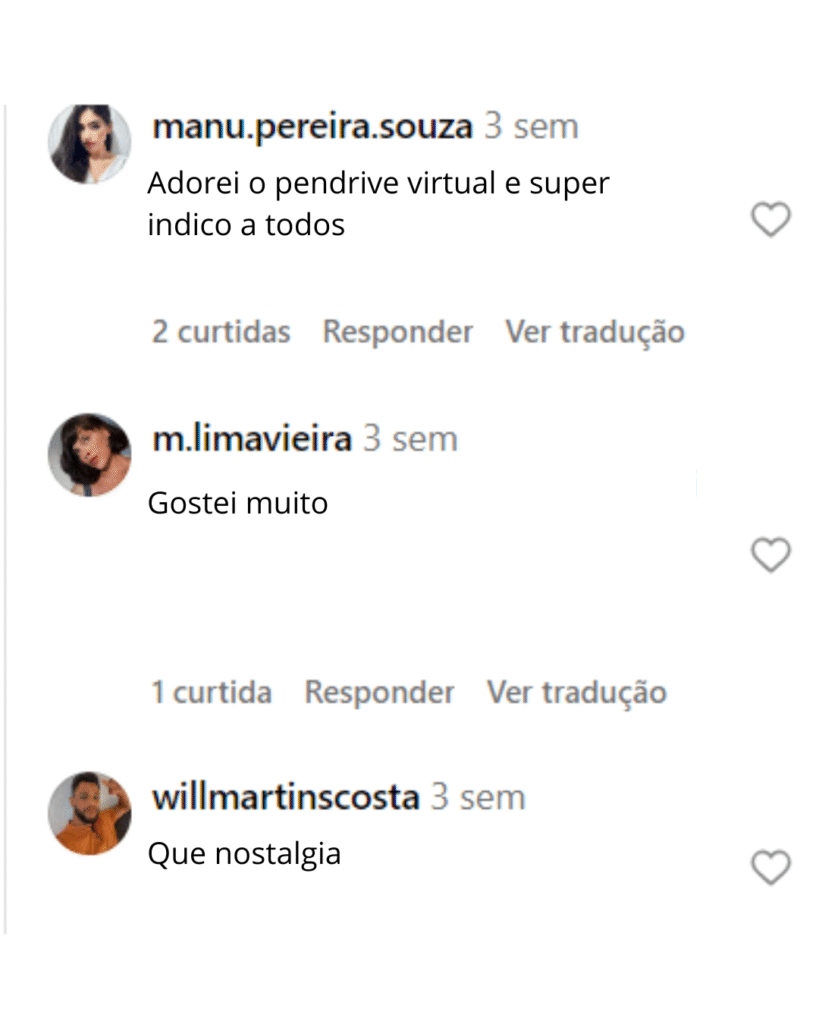 O Pendrive Virtual é uma coleção digital exclusiva que contém mais de 500 músicas de flashback anos 70,80 e 90, organizados em pastas para facilitar o acesso e a experiência de uso.